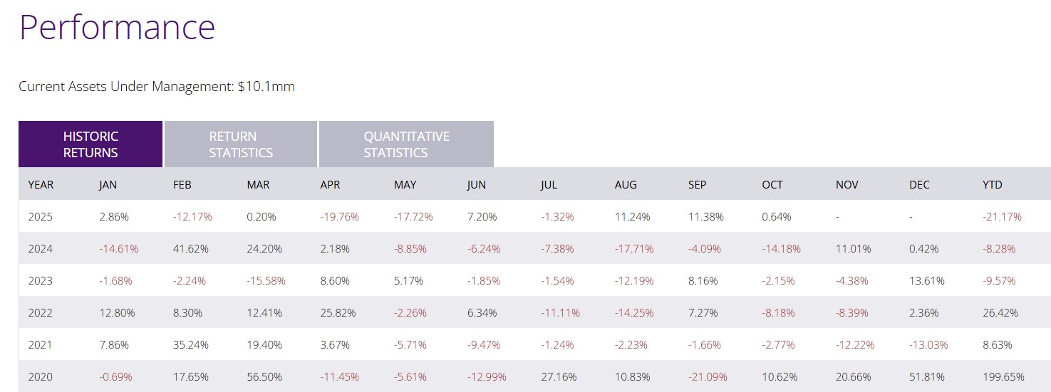 Here's one of my favorite pure trend following firms (Purple Valley Capital). It made 199% in 2020. And this year?