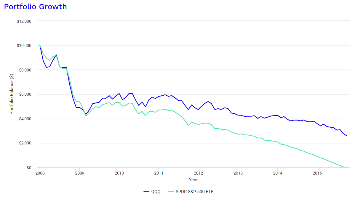 Here's what happens if we take QQQ back to 2008 (SCHG data doesn't go back that far):