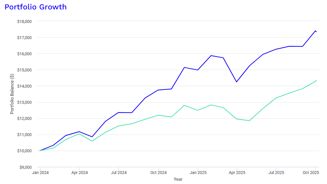 Here is the Report and also the Curve from January 2008 (uh oh!) until October 2025. My system is on the left; SPY is on the right:
