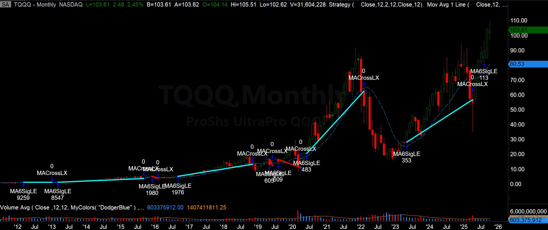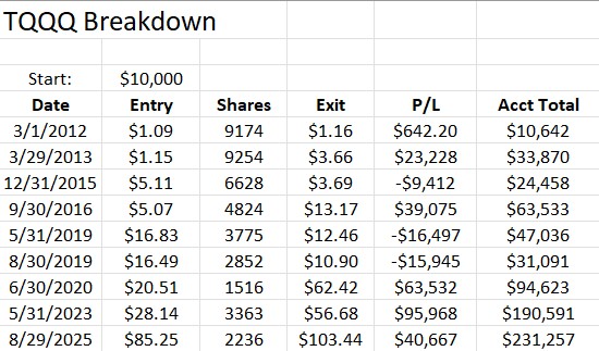 Below are the trades on TQQQ using the Incredible rules. Remember, this trades on a Monthly chart:
